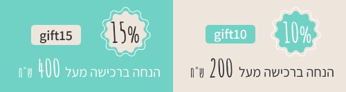 10% הנחה בקנייה מעל ₪200 | 15% הנחה בקנייה מעל ₪400 | לא כולל מארז החלומות